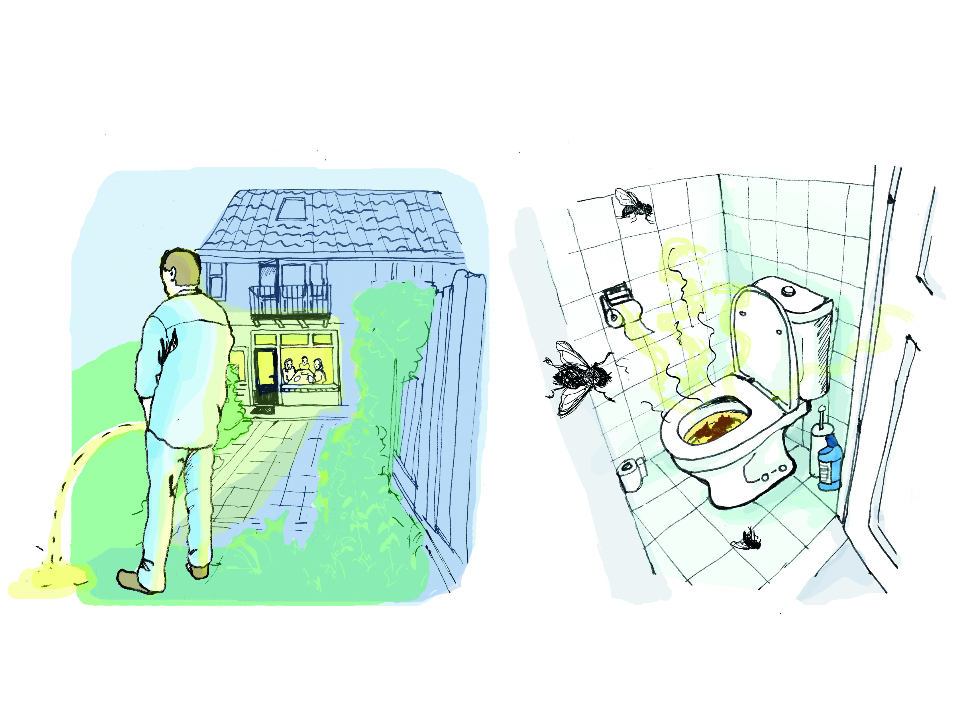 Decarbonet: Dilemma Opdrachten Illustratie thema Energieverbruik Bij dilemma; ‘Pee in the garden’-or-‘not flushing it down the toilet.’ Gerelateerd